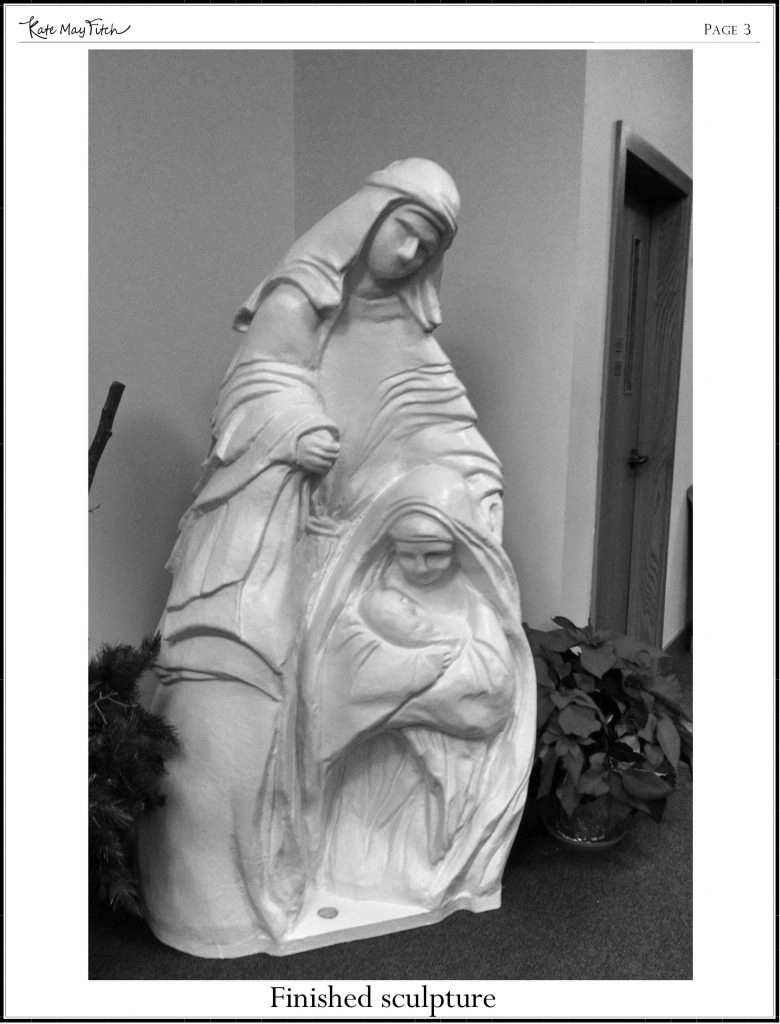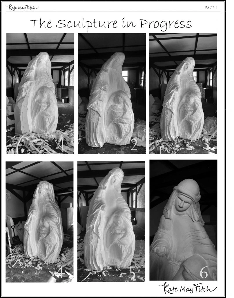 This Madonna was carved from 3 blocks of .9 lb EPS foam 24” x 48” x 96” that were glued together. The photos take you through the steps from the beginning to the finished coated sculpture that looks like it was carved from stone. Artists all over the country are using EPS because it easy to carve, lightweight and economical. The finished sculpture can be finished to look like any material from stone to clay.