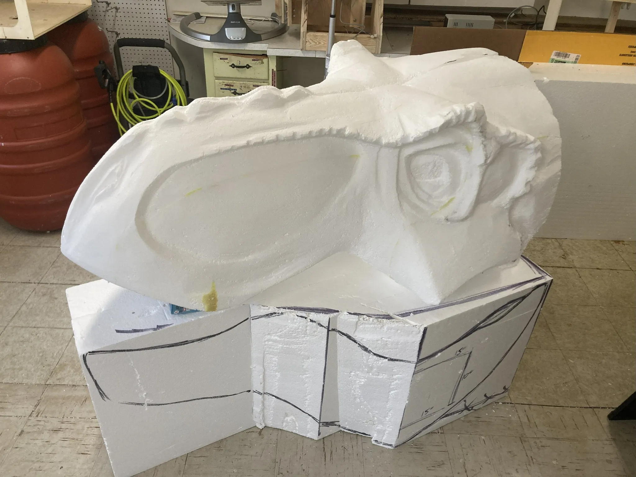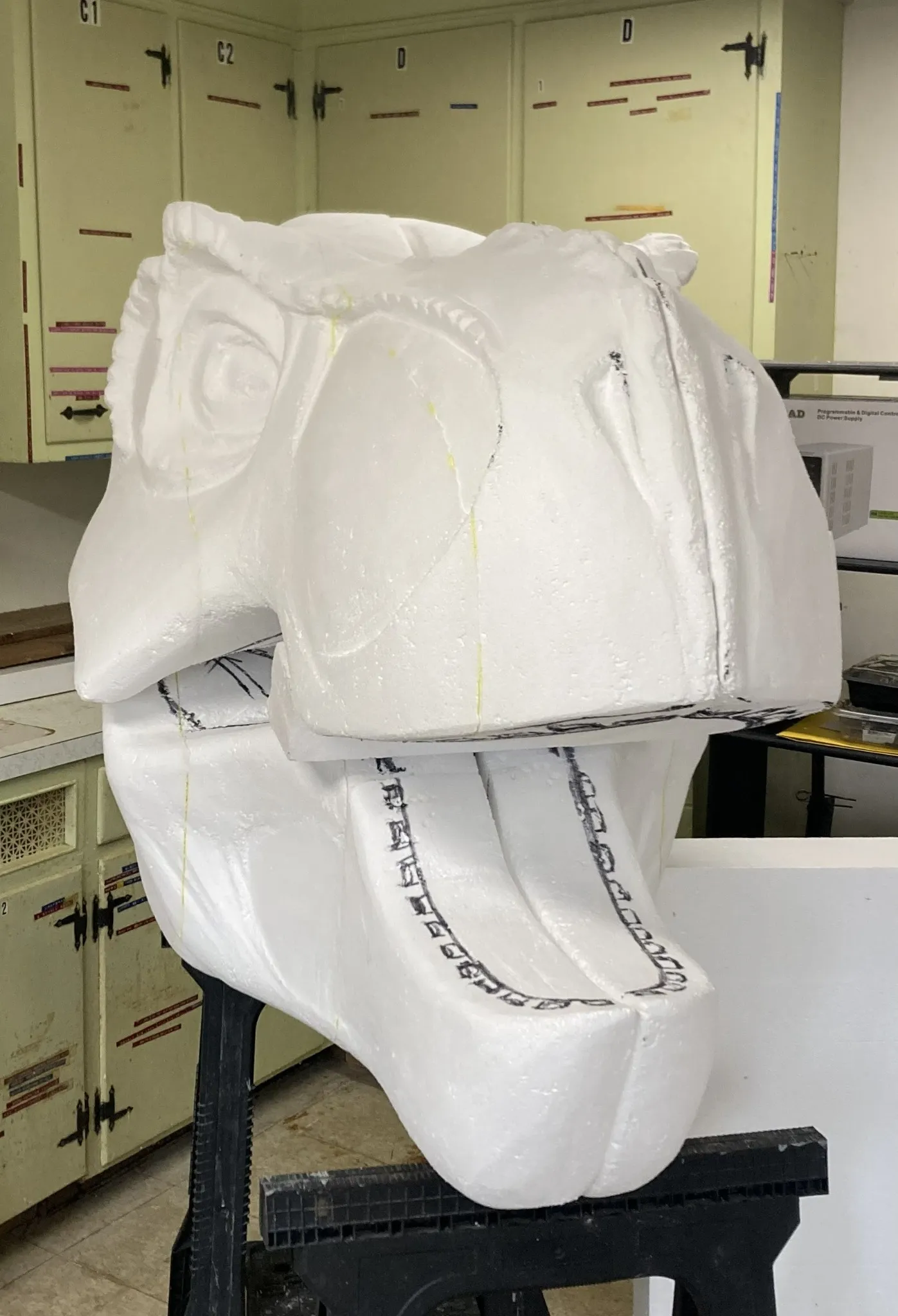 Working with 6” thick EPS sheets, the builder sculpted and shaped the Foam using a variety of cutting tools to achieve the intricate details and fierce expression of this realistic—and slightly terrifying—creature. The lightweight yet durable EPS provided the perfect medium for carving, supporting fine details while maintaining structural integrity for movement and display.