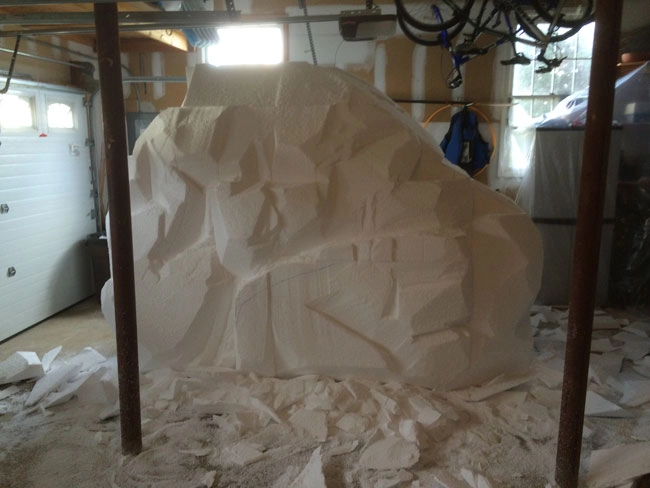 Artificial Boulder from EPS Foam, I took the 4 blocks I purchased, and after some cuts and gorilla glue, stacked them into a cube. Then using a chainsaw and homemade nichrome hot wire cutter, I sculpted a huge boulder (7′ high, 9′ long and 6′ thick), that we then painted with various shading and textures to create a very realistic and dramatic looking boulder.