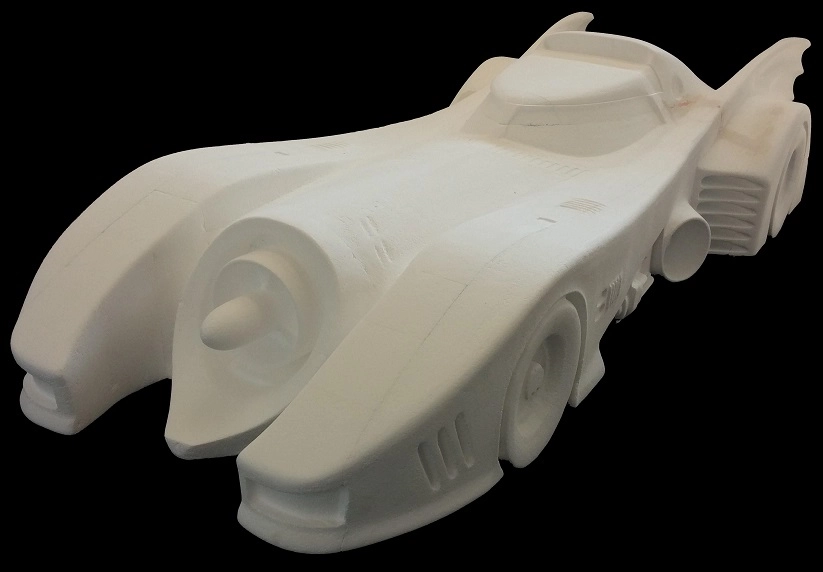 This full size expanded polystyrene car was produced for a function celebrating the super hero that drives it. The iconic Batmobile was constructed of .9 lb density EPS and then finished in black. A combination of different tools and different techniques were used to produce the car out of EPS blocks. The expanded polystyrene Batmobile is one of several vehicles that have been produced by Universal Foam Products for various functions.