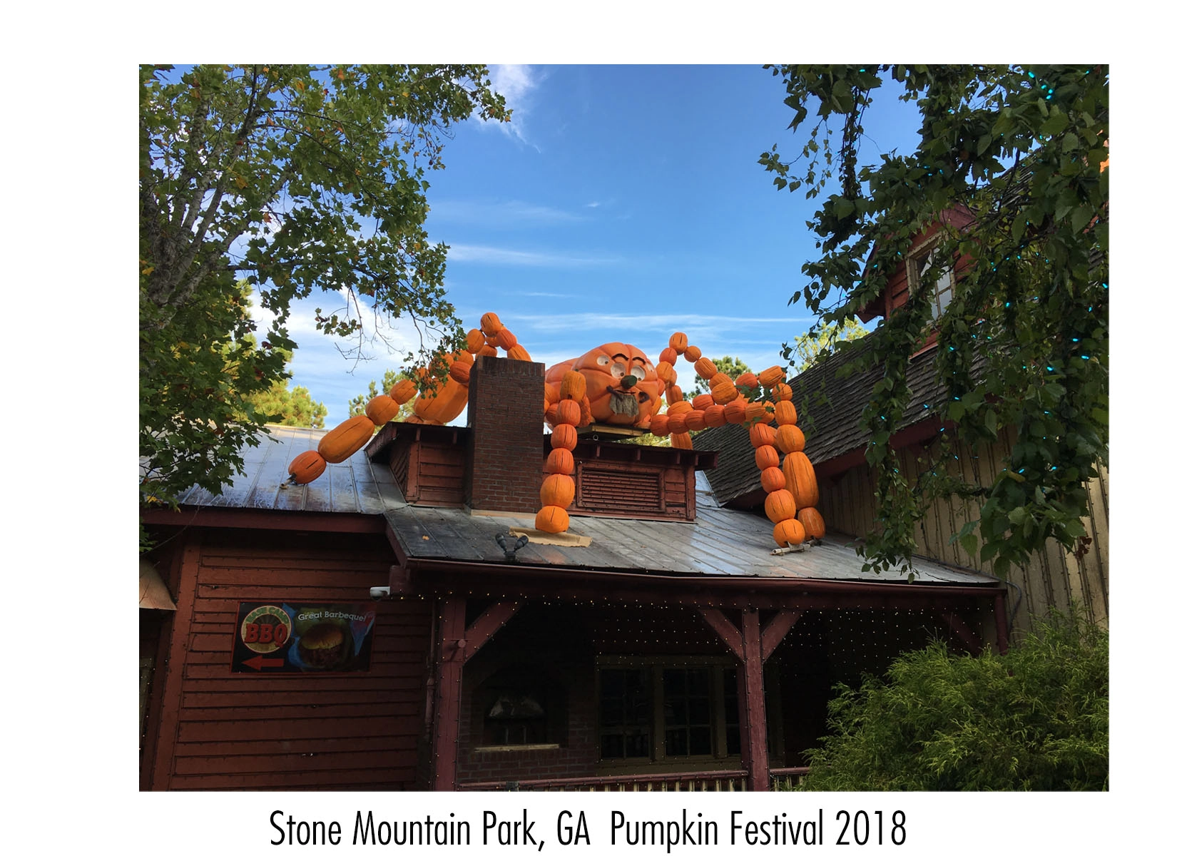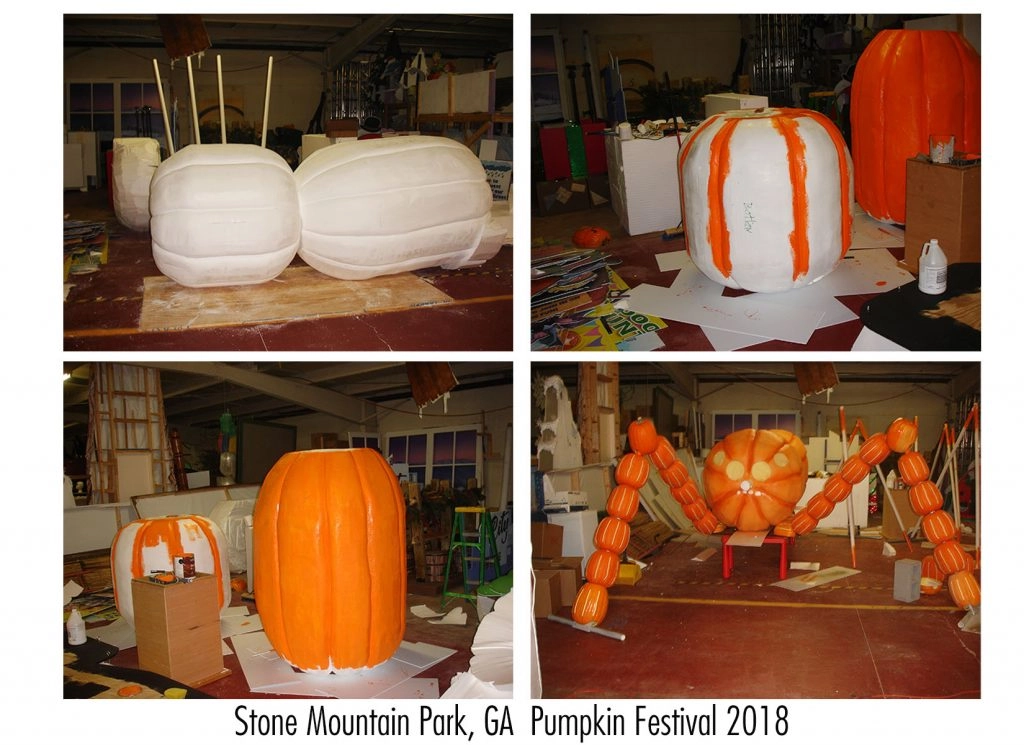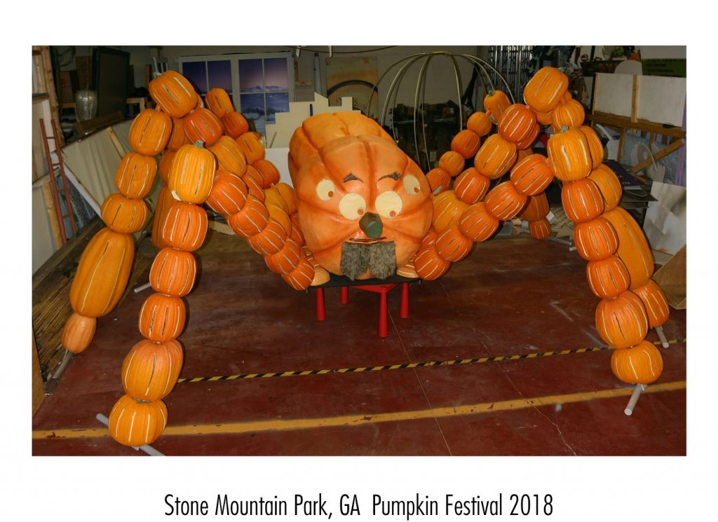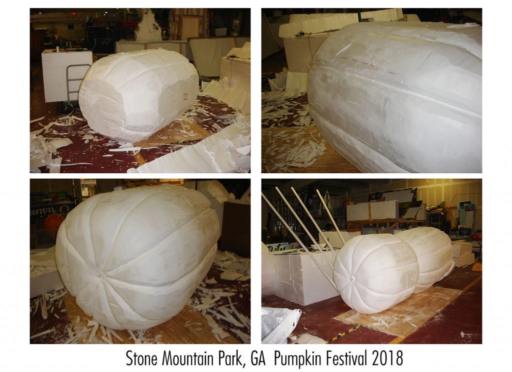Nine giant blocks of .9 lb density EPS foam blocks were used to carve this giant spider, pumpkins and many smaller Jack-o-lanterns at Stone Mountain Park in Stone Mountain, Georgia. The artist used a 4’ compound bow cutter for the main cuts and hand tools for the more detailed cuts. The spider was placed on the roof of their store and the pumpkins and jack-o-lanterns covered the entryway for the 2018 Stone Mountain Pumpkin Festival.