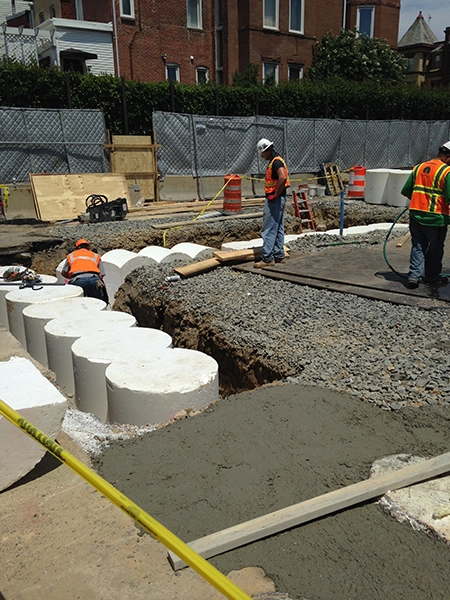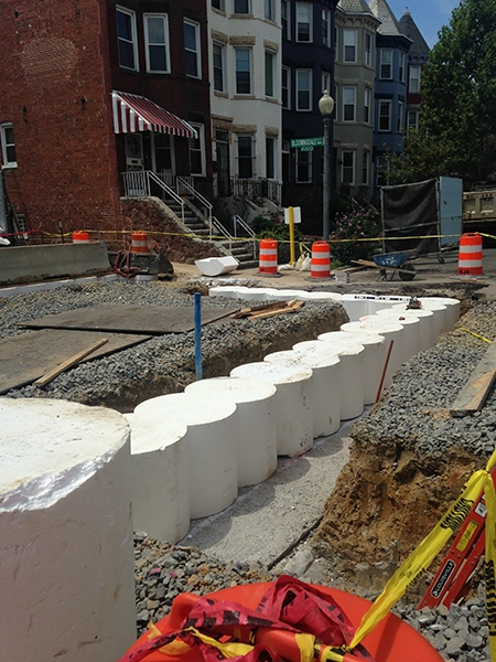 The customer had us quote 1LB EPS that was cut to form a secant wall form for a location that had limited space and other site restrictions in Washington DC. This type of design is common in areas where buildings are close to each other and strong foundations need to be poured when property lines cannot accommodate standard foundations. The EPS forms are used as block-outs so the concrete can be poured around the EPS which in turn forms the guide walls for the steel piles to be set. Universal Foam received the prints, did a take–off, designed a lay-out and labeled each block for an easy installation.