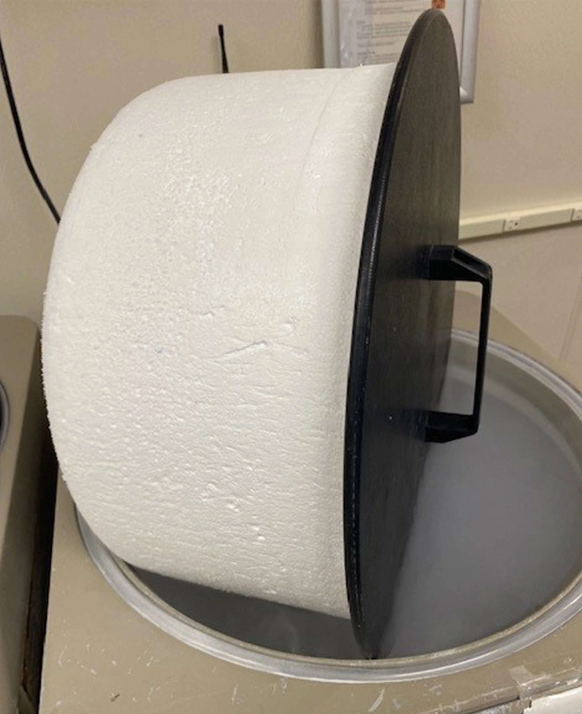 Custom cut EPS was provided to this Cryogen Bank in Fairfax, Virginia as a lid insulation insert to maintain the liquid nitrogen temperature at a chilling -196 degrees Celsius. The foam was custom cut to precisely fit into the top of the tank. In the past Universal foam Products has provided components for this application as well as a complete tank carved out of a large block of EPS. Expanded polystyrene is an excellent insulator and is available in sections up to 48” thick.