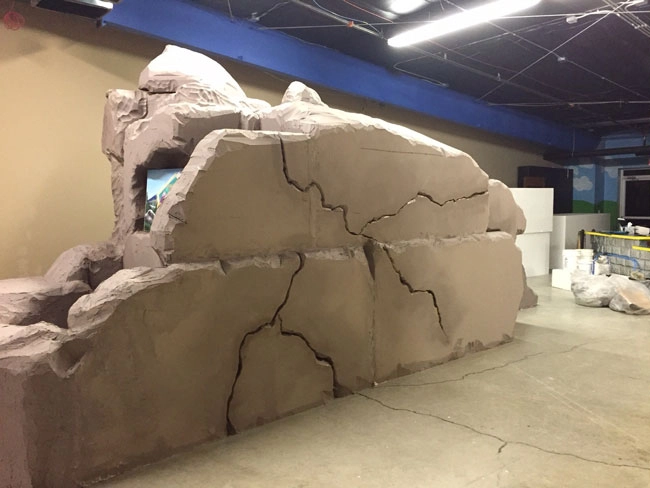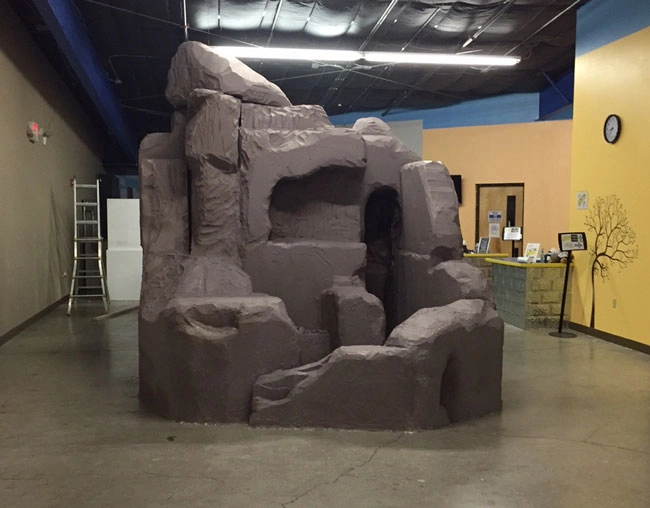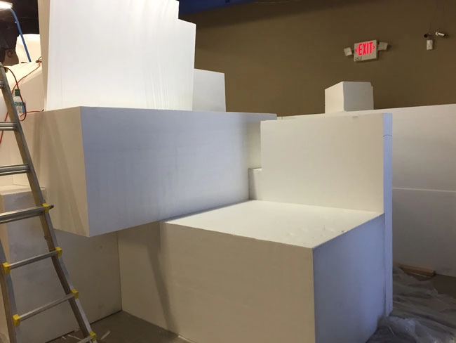 23 foam blocks of 1 lb Virgin EPS 36” x 48” x 96” were used to create this giant rock formation for a production by The Connection Church in Texas. The project was designed, carved and coated by members of the church. 1 lb EPS is the most commonly used material for large carvings. It is best carved with a hot knife but can be carved using anything from a serrated knife to a chain saw.