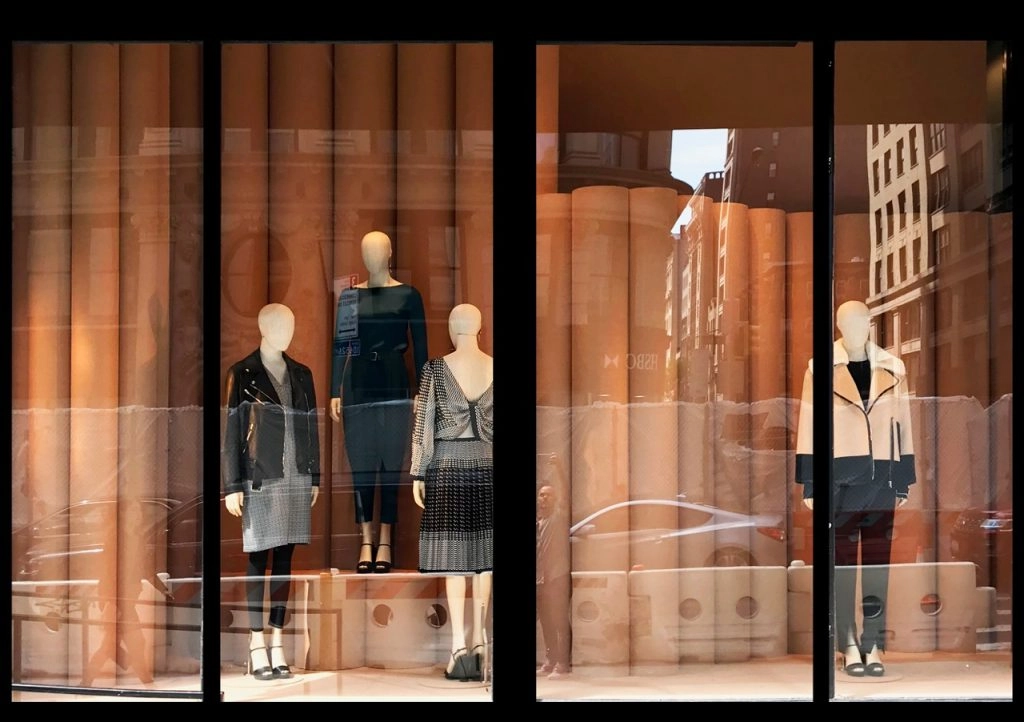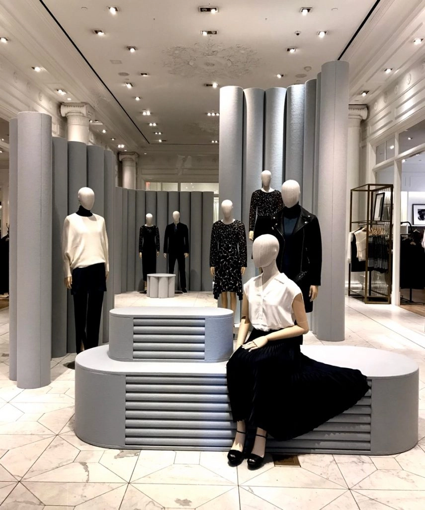 Expanded polystyrene (EPS) is economical, lightweight, carvable and is available from locations throughout the US and Canada. It can be purchased in block form or precut to your specifications. The core of the columns used for this window display in New York City are 1.8 lb density EPS shipped to the studio as half columns. In all, 360 half columns ranging from 5” diameter to 14” diameter were used to create the display. The columns were covered with fabric. The window display and in-store displays were a big hit with customers.