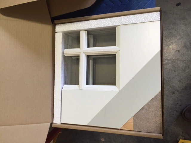 Nominal 1 lb EPS foam with 10% to 15% recycled content is used to protect these exterior glass door samples during shipping. The manufacturer in Shelton, Washington purchases 2 different sizes to fill out the box and protect the glass at the corner.