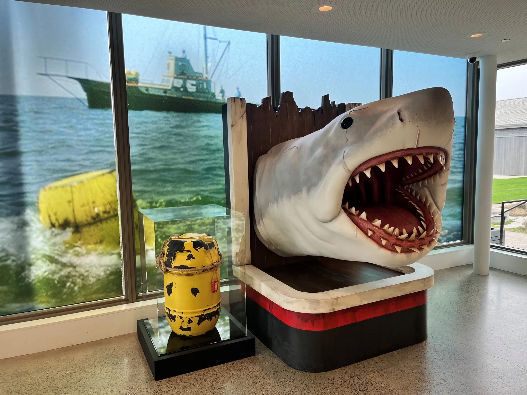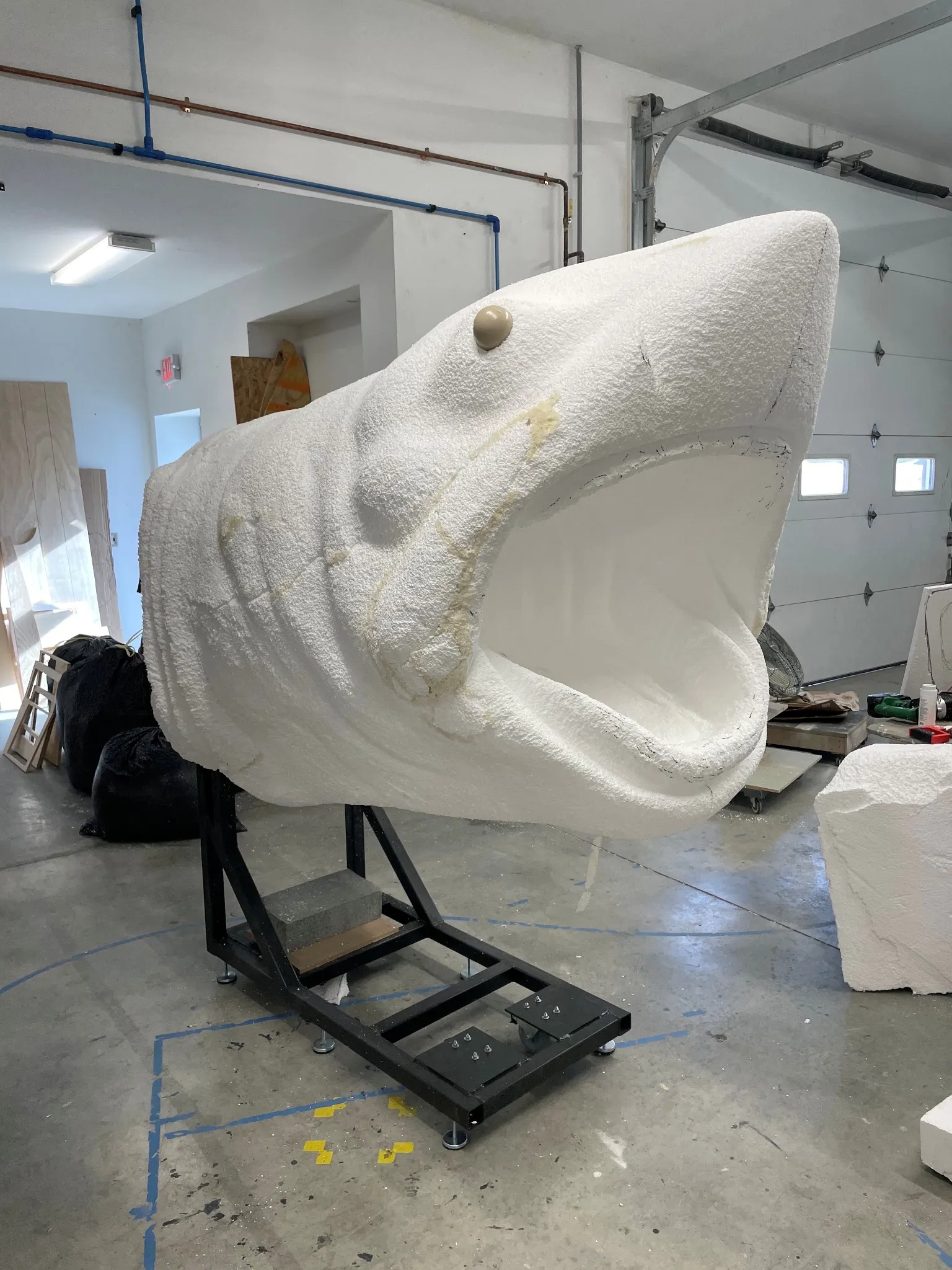 Starting with two large EPS blocks from Universal Foam Products, the team carefully sculpted the shark based on detailed reference images. The finished piece was hard-coated, painted, and enhanced with over 100 custom-molded resin teeth and epoxy-cast eyes. The sculpture is supported by a custom steel frame and displayed in a scenic environment designed to resemble the boat from the film.
