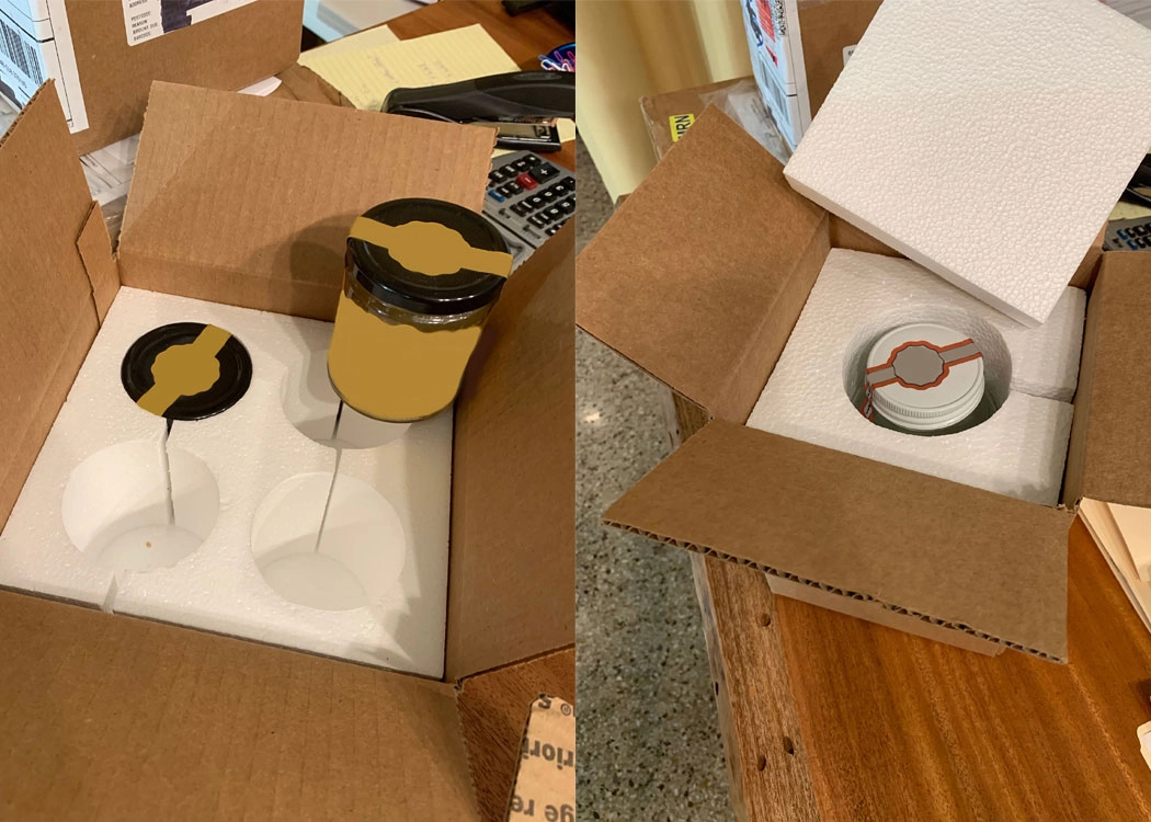The accompanying photos are from a company that is selling a product they wanted to offer in a single pack, 2 pack and 4 pack. Starting with the customer’s sketches, Universal Foam Products created some prototypes for testing. The foam was sized to fit stock corrugated cartons so they could be ordered in small quantities. The prototypes were sent to our customer so they could ship their jars to different parts of the country and make sure the EPS would keep the jars from breaking. When the testing was successful, they then began to purchase the EPS in large quantities and market their product.