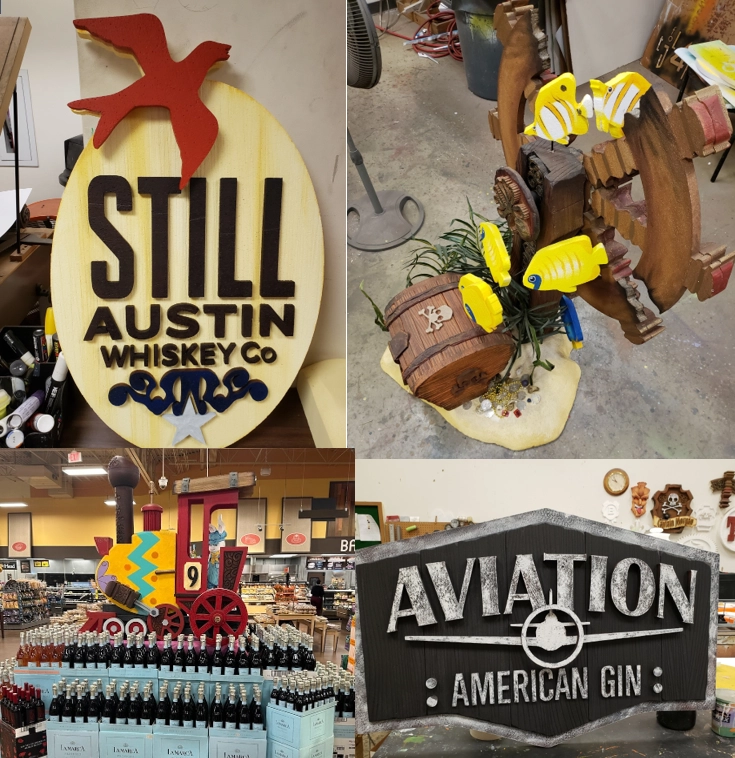 EPS Foam sheets and a CNC machine, just about anything you can think of could be cut, shaped, and painted for custom signage. This customer in Farmers Branch, TX produces all types of signs/displays for their Wine & Spirits company. All signs are produced from 1” layered sheets using 2 lb