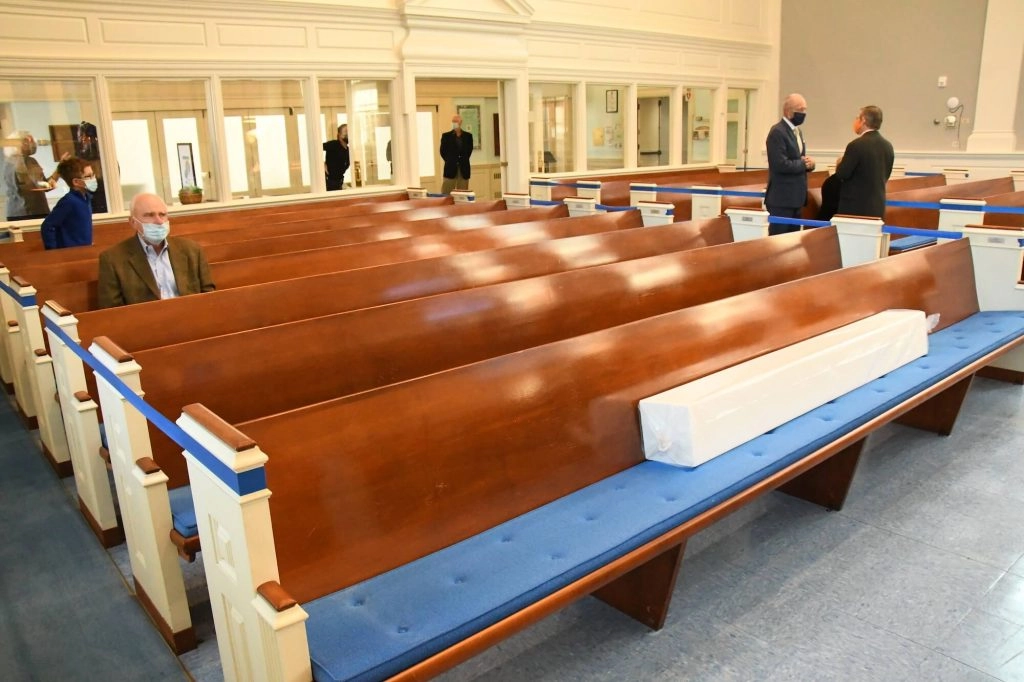Wayne United Methodist Church in Allentown, Pennsylvania found a creative way to enforce social distancing during the Covid-19 outbreak. They used 8″ x 8″ x 72″ blocks of expanded polystyrene weighing less than 3 pounds each to create “Social Distancers” in the church pews. The lightweight EPS blocks were covered in 3 mil polyethylene tubing for easy sanitizing between services.