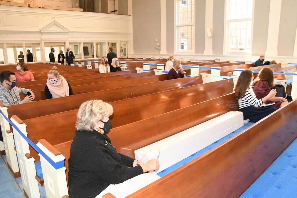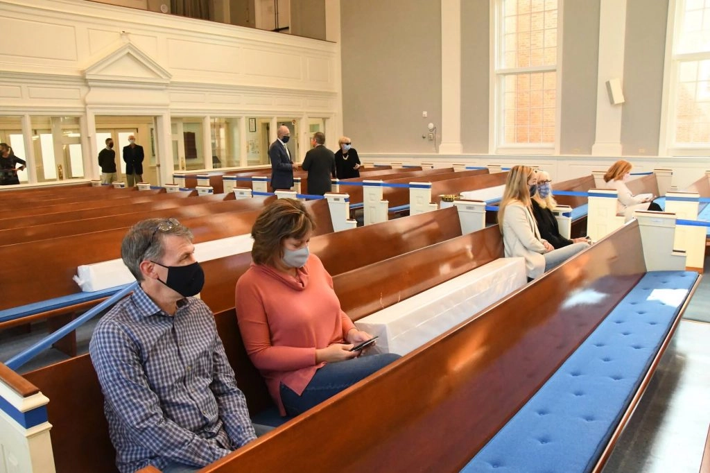 The distancer rests on the pew until someone sits down beside it. After being seated the congregant slides the distancer over next to them which creates the greatest amount of seating possible at the other end of the pew while maintaining the recommended six feet of separation. This process allows them to make the best use of the socially distanced 6-person/pew seating capacity in worship.