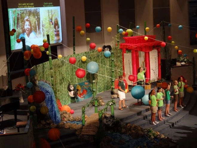 Cedar Crest Bible Fellowship Church used .9 lb Virgin Expanded Polystyrene foam to create the scenery for their Vacation Bible School, which is for one week every summer in Allentown PA. The theme was PandaMania. This particular year they didn’t paint the backdrop panels, but used bamboo fabric hanging over the EPS panels. They used a hot knife to cut the foam to make the pergola and bridge planks. With a little artistic ability anything is possible with EPS Foam.