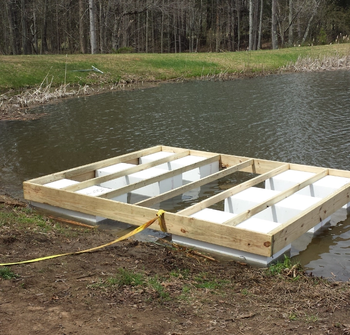 This floating platform on a private pond in Culpepper, VA was constructed with 6 blocks of .9 lb density EPS Foam 12” x 24” x 48” and pressure treated lumber. Docks similar to this have been in operation for over 30 years in some cases with the original EPS floatation still in use.
