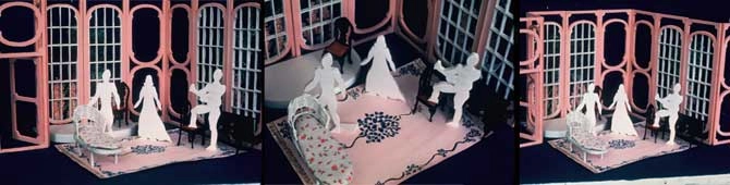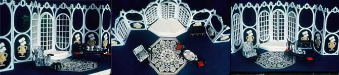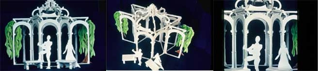 The opera is Don Pasquale – Acts 1 2 3 – Don Pasquale’s Solarium – Norina’s Sitting Room – Don Pasquale’s Garden Gazebo – three views each act – the model and the set were made of EPS Foam with full length cloth hinges. The set panels were 3″x4’x12′ – The set was generally 12’x32′ – The risers and benches were made of composite EPS and 1/2 plywood covered in muslin and painted – The photos are of the model.