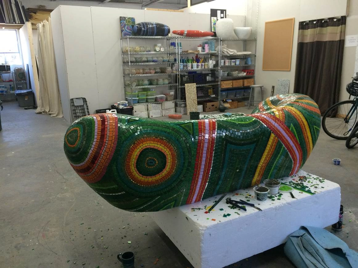 35 sheets of ½” x 48” x 96” expanded polystyrene (EPS) were used to carve this mosaic tile bench in Silver Spring, MD 20904. This is the latest of several creations from this artist using expanded polystyrene. EPS is rapidly becoming the preferred material for sculpting for artists throughout the country due to its light weight and ease of carving with an electric hot knife.