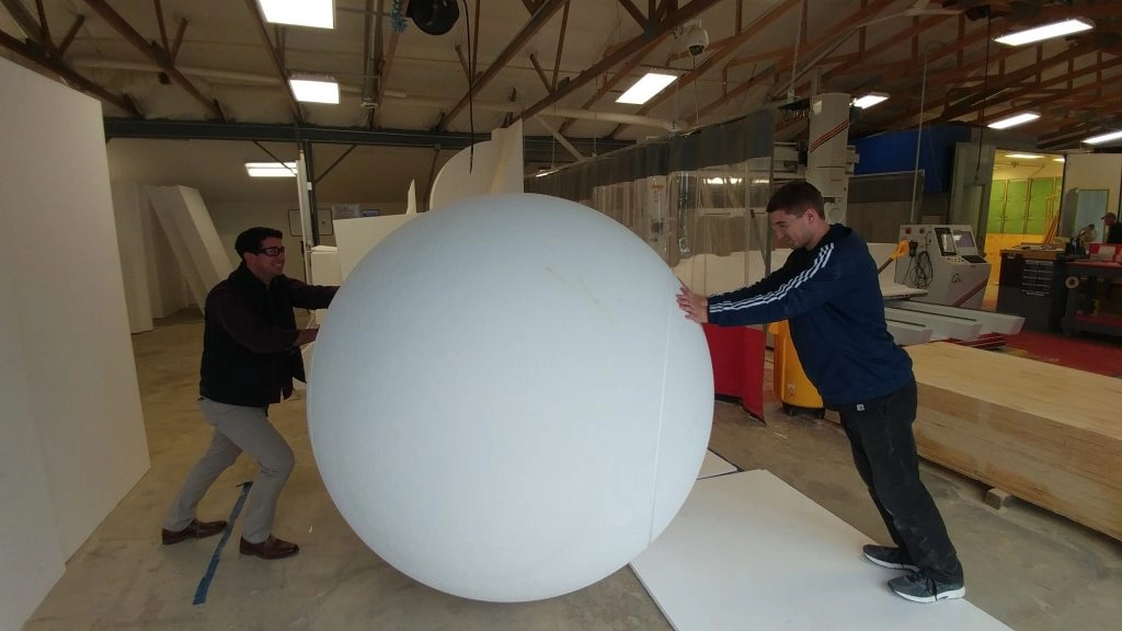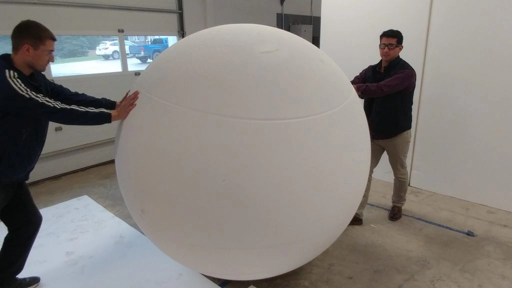 Universal Foam Products can provide EPS and Styrofoam balls and spheres from 1” diameter all the way up to “your budget is the limit” diameter. Balls and spheres up to 30 inch diameter are molded and produced in volume so they are economical. The larger spheres are done by hand, so the price reflects the amount of material and time involved. Typically, the larger spheres are used for department store displays or large signs. The smaller balls and spheres are used for everything from craft projects to solar systems and holiday displays. This particular 6 foot diameter sphere , when it is completed, will be a giant tennis ball for a display.