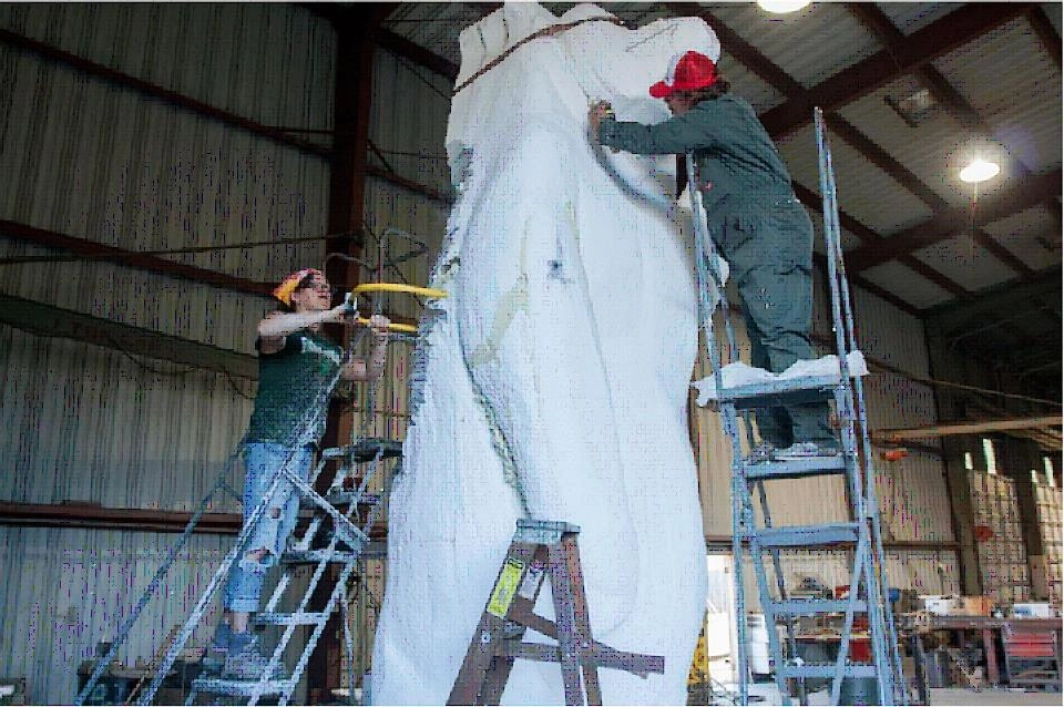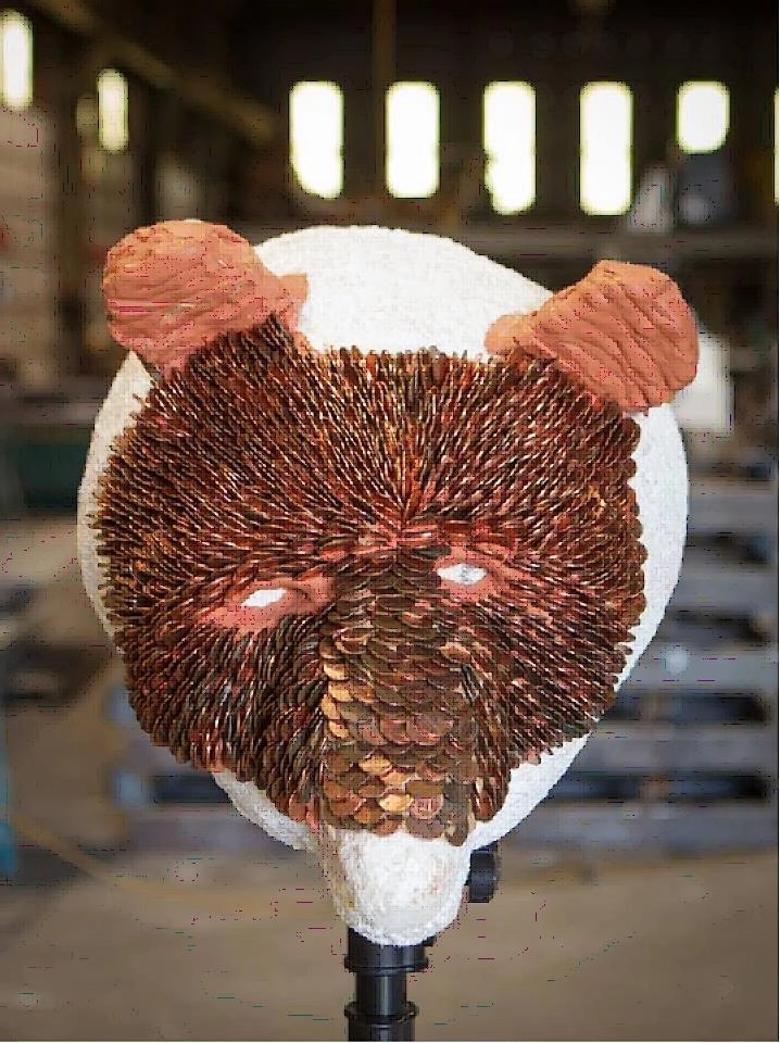 Over 500 cubic feet of 1.35 lb density EPS was used to create this huge EPS foam bear sculpture for the Burning Man Festival in Nevada. 12” thick blocks were laminated together; then the carving process began. The bear was carved using a bow cutter, hot knife and finally sand paper. After the sculpture was carved, thousands of real pennies were glued to the sculpture making it a very unique, very large bear. After the festival ended, the pennies were removed, and the money donated to bear conservation projects in Montana and Canada.