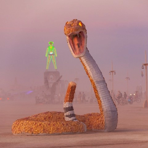 The second sculpture was for this year's Burning Man in the Black Rock Desert. The artists created a 15 foot tall western rattlesnake. Over a frame of steel tubing they overlayed the EPS blocks and carved out the shape. The snake was a unique shape to carve as the foam needed to go from wide to narrow several times to resemble a snakes body. This sculpture was also entirely hand carved with using small hand tools and did not use computers or machines. The snake was covered in over 3,000 concrete flowers hand painted in metallic gold, copper, bronze and silver. This is a very durable piece of art and it was well received at Burning Man. It is now on loan to Burning Man's new art trail and training facility in Gerlach, Nevada. Well done Lisa and Robert!