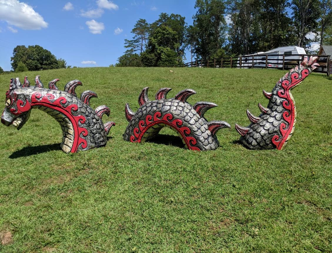I was done carving on the middle section and started painting there. Carving had taken time, but the paint went on easy. Cream colored under belly with silver and black high lights, crimson waves on the sides, silver scales with black underneath and silver spikes with red and black high lights completed the creature. I sealed the total paint job with two layers of polyurethane.