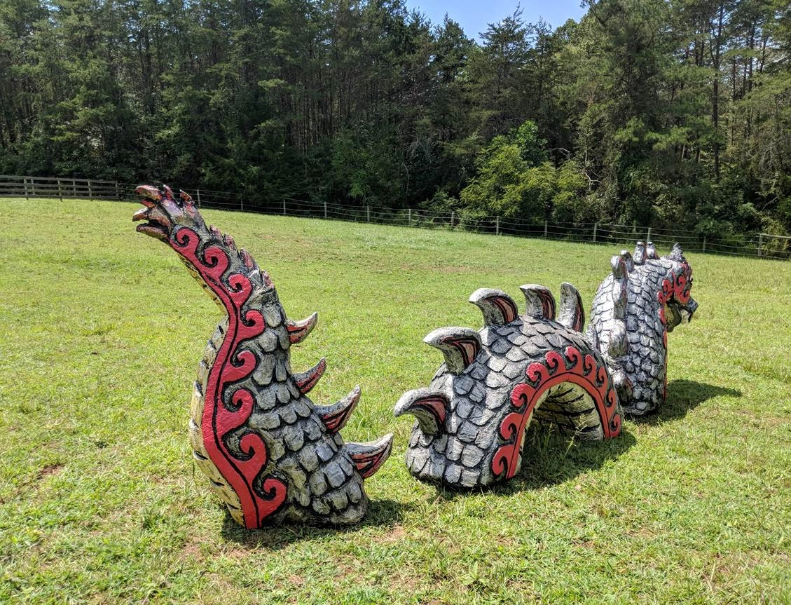Now it was time to introduce Sea Serpent to water! I had the method of flotation thought out and materials acquired. Mother nature had different plans. A sudden spring storm sent an 80 foot yellow pine crashing into my pond. Right where the serpent was to go!! If he had been there, he would have been crushed. He is destined to be a land animal for now. There has been no time for removing the tree. It will be a major cut and drag operation. Living on a sea of grass is not a bad thing. The horses did not want to share at first but are grudgingly content now.