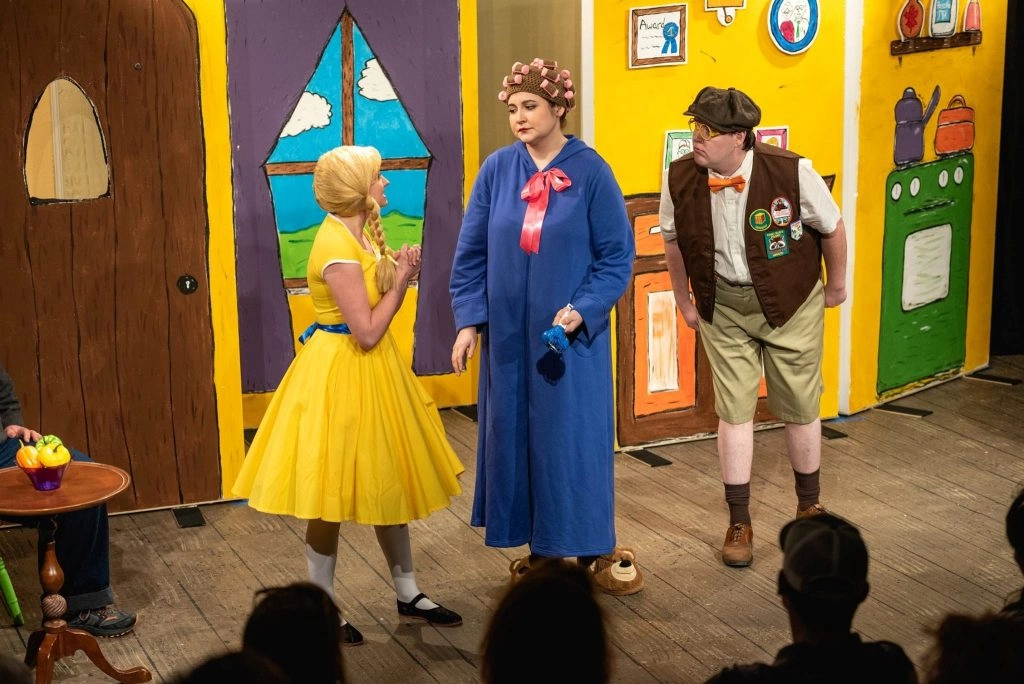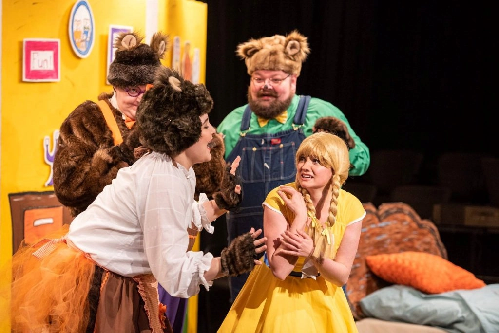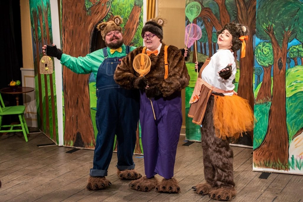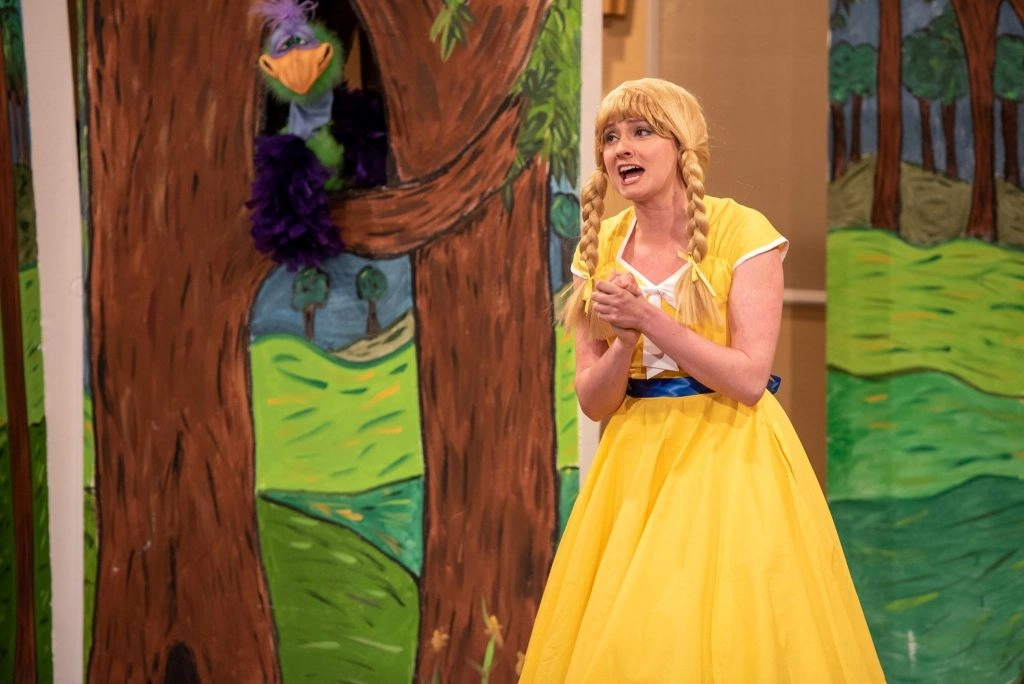 We thought we would share what we did with the foam! Open Classical’s children’s operetta production of “Goldilocks!” by Mark Landson started a few weeks ago and ended this past weekend for its premiere run in Dallas. We ended up using 4′ boards as feet attached by magnets on the bottom for stability. We painted both sides for home and forest scenes. These were very lightweight to handle and just portable enough to put in a theater space with limited time to change presenting companies. We were part of a festival so acts were changing out about every 30-45 minutes on the stage. And I braved exploring a new talent for cutting and carving out the hole for the door/tree for the bird puppet to make his appearances.