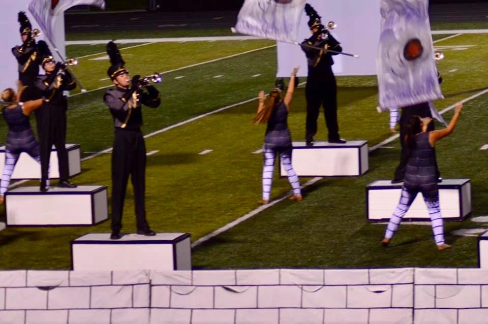 The half-time theme for the Noblesville High School Band from Noblesville, IN was “Breaking Down the Wall”. To emphasize the theme, each of the band members stood on a block of .9 lb density expanded polystyrene 18” x 24” x 48”, trimmed in blue, to represent blocks removed from the wall. The blocks weighed just 11 pounds apiece, making them very easy to move on and off the field quickly.