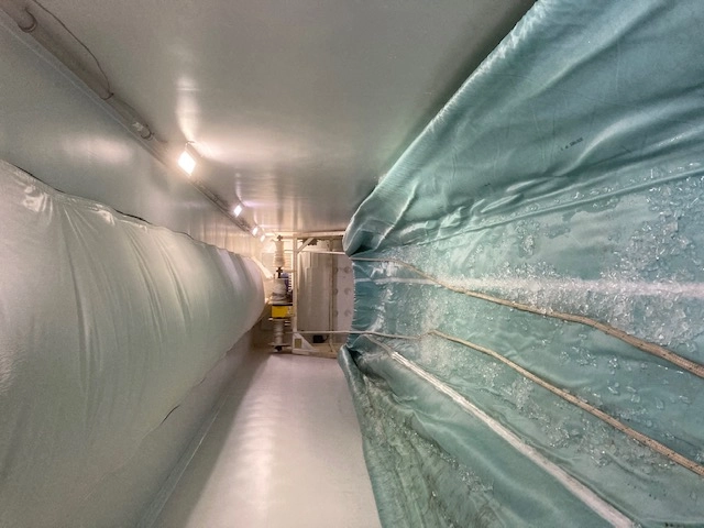 This customer in Alabama purchased 8 foot long wedge-shaped pieces to line the lower edges of their truck for accommodating wide pipe liners. The liners surpass the width of the trailer's floor, prompting the use of Styrofoam wedge shapes along the bottom edges. This strategic placement generates a U-shaped configuration within the trailer, enabling the loading of a 120-inch-wide pipe liner into a space designed for a 96-inch-wide trailer.