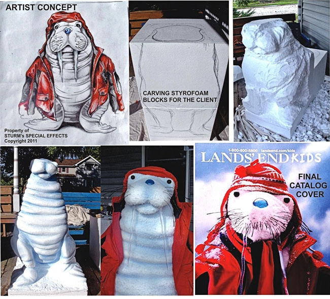 When Lands’ End needed a model for their 2012 children’s catalog they contacted Sturm’s Special Effects. Sturm’s sculptor Kelly “The Kid” started out with a concept sketch from their Art Director, then carved a full size model of a walrus out of expanded polystyrene (EPS), purchased form Universal Foam Products. The finished model was dressed, photographed and Photoshopped for the cover of a very successful catalog.