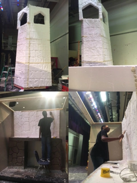 Expanded polystyrene (EPS) blocks and sheets are typically used for theatrical props because of their light weight and strength. They are economical and can be coated with a variety of different coatings to achieve almost any desired effect. This school in Walton Beach, Florida was especially creative when they used 4′ x 8′ panels of 6″ thick EPS to create a rock face for this tower and additional fire place and stone walls by rubbing out the grooves with a grill brush. Cutting with the grill brush was messy but effective.