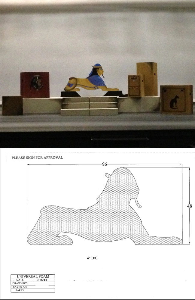 Universal Foam Products created an EPS Sphinx for Mountain Home Schools in Arkansas for a play they were performing. The Sphinx was delivered precut from 1 lb density virgin EPS 4” x 48” x 96” and a pattern was cut into the EPS using a CNC router to show them where to paint. Universal provides theatrical props for churches, schools and professional theater groups around the country.
