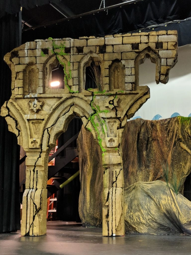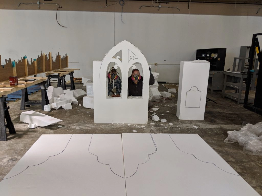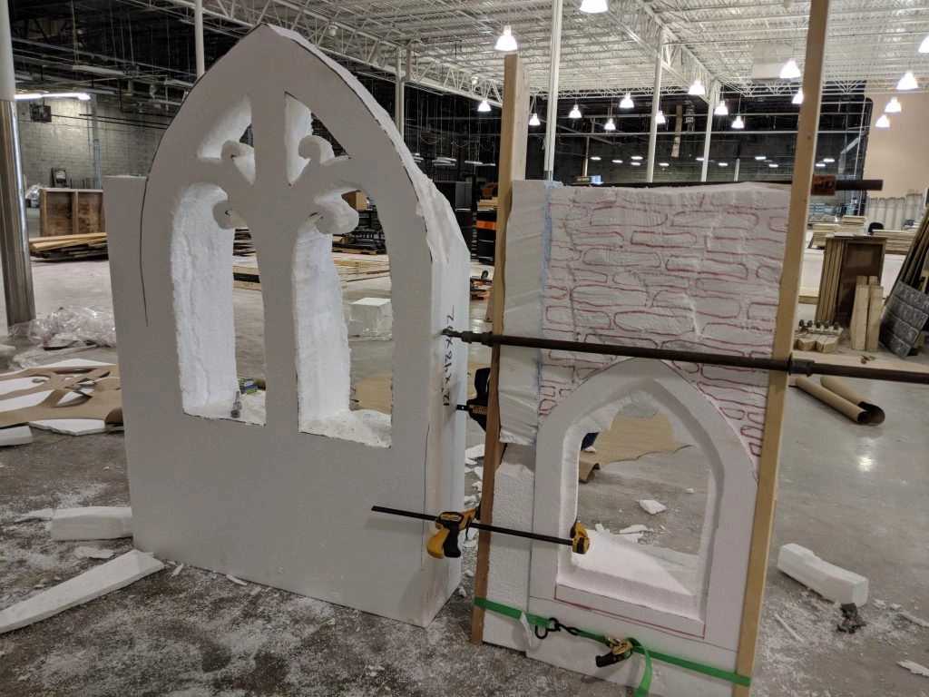 For this project, 12” thick blocks of nominal 1 lb per cubic foot density EPS was used in sizes ranging from 4’ x 6’ to 2’ x 8’. The blocks were carved using a hot wire tool and a hot knife as well as a standard handheld drill. The mortar joints were cut using a hot knife and the weathered texture was created using a heat gun. The pieces were coated with a latex primer, then painted. The two people that built the props had never worked on EPS before. They are already designing their next project which will be bigger and bolder than the first.