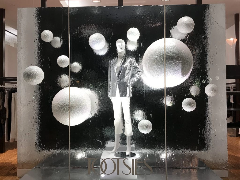 24” and 30” diameter EPS spheres were used to create this modern window display at Tootsie’s, an upscale women’s boutique in Houston, Texas. The artist covered the spheres with spray adhesive and chunky Mylar glitter to create this eye-catching display. Stock EPS balls and spheres are available from Universal Foam Products from 1” to 30” in diameter. Custom spheres are available in any size needed.